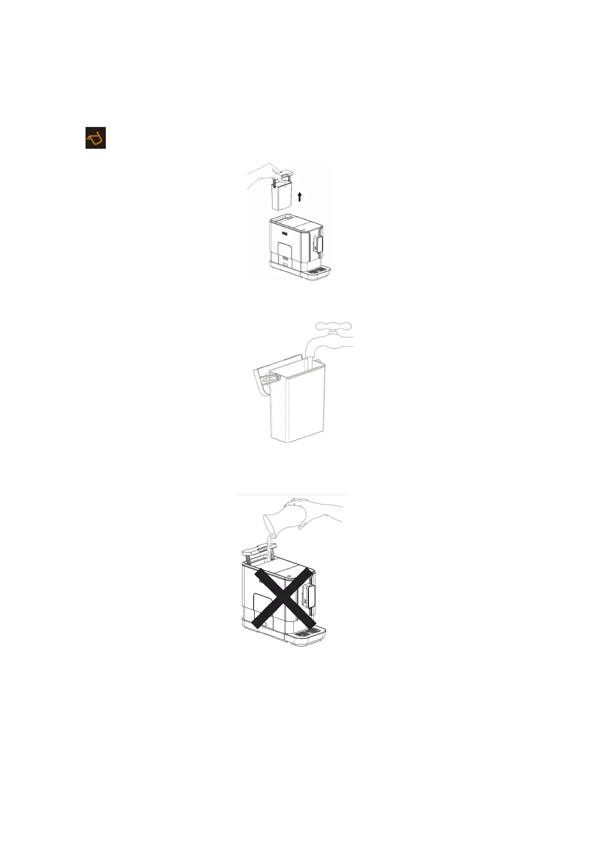 IMPORTANT: Never fill the water tank with warm, hot, sparkling water or any other liquid which