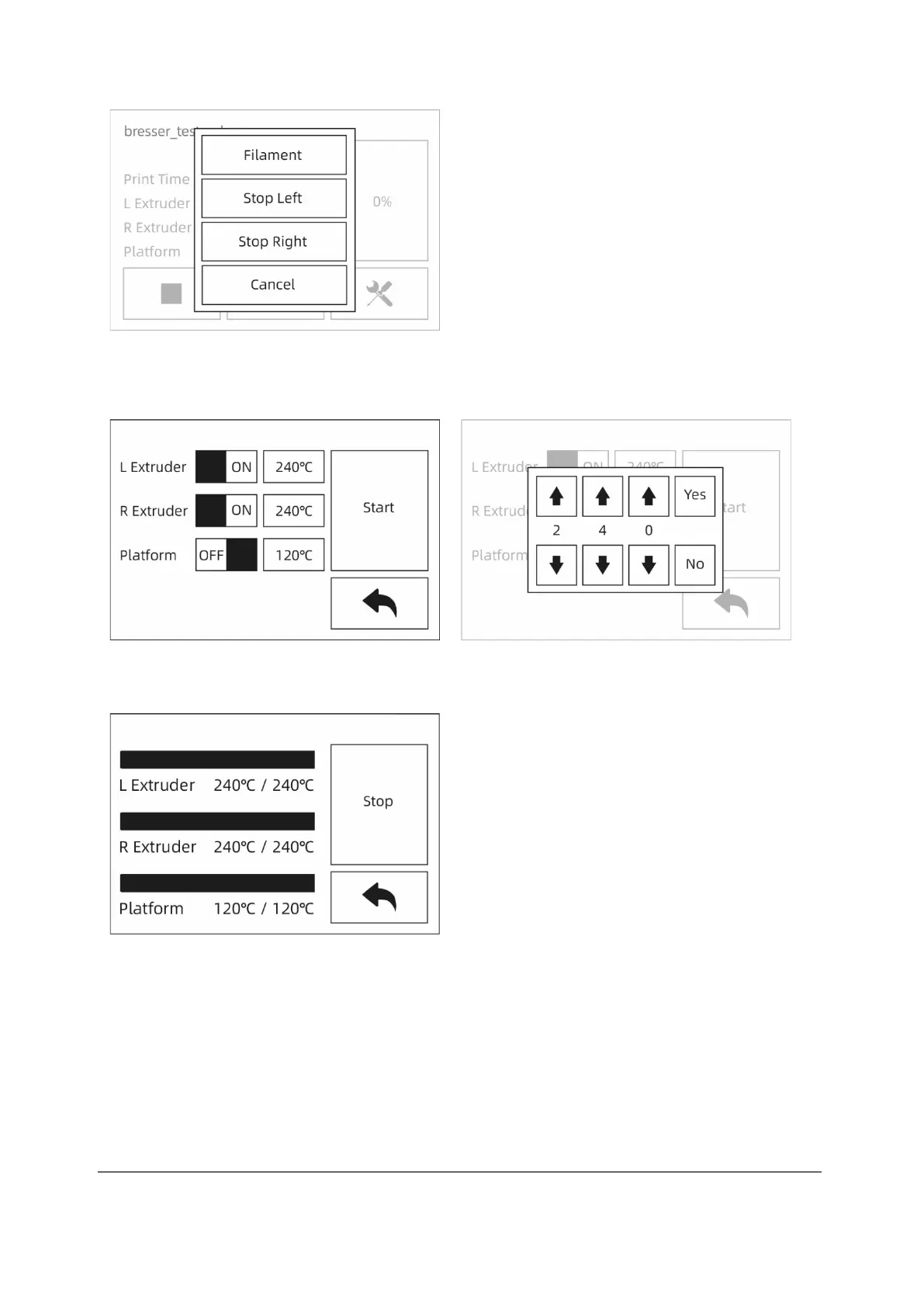 ① Touch [Preheat] to preheat the extruder or platform. Set the target temperature
