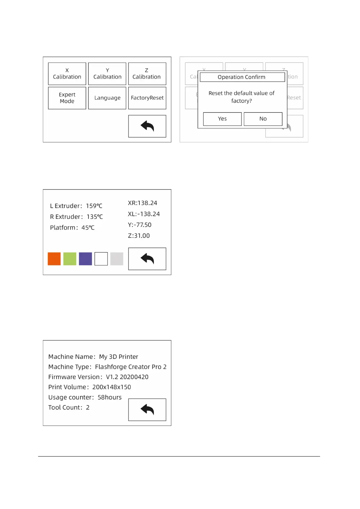 Bresser T-REX2 - Resetting to Factory Settings; Printer Status Information Display; XYZ Axis and Temperature Status; Basic Device Information