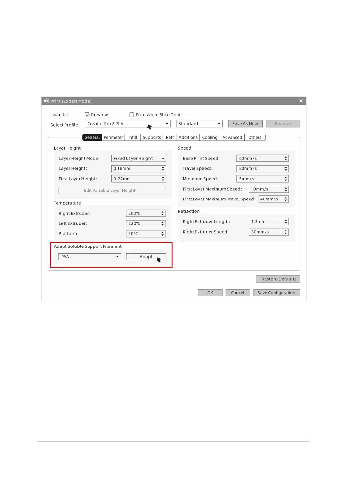 displayed. Select the materials, including Creator Pro 2 PLA. For printing with