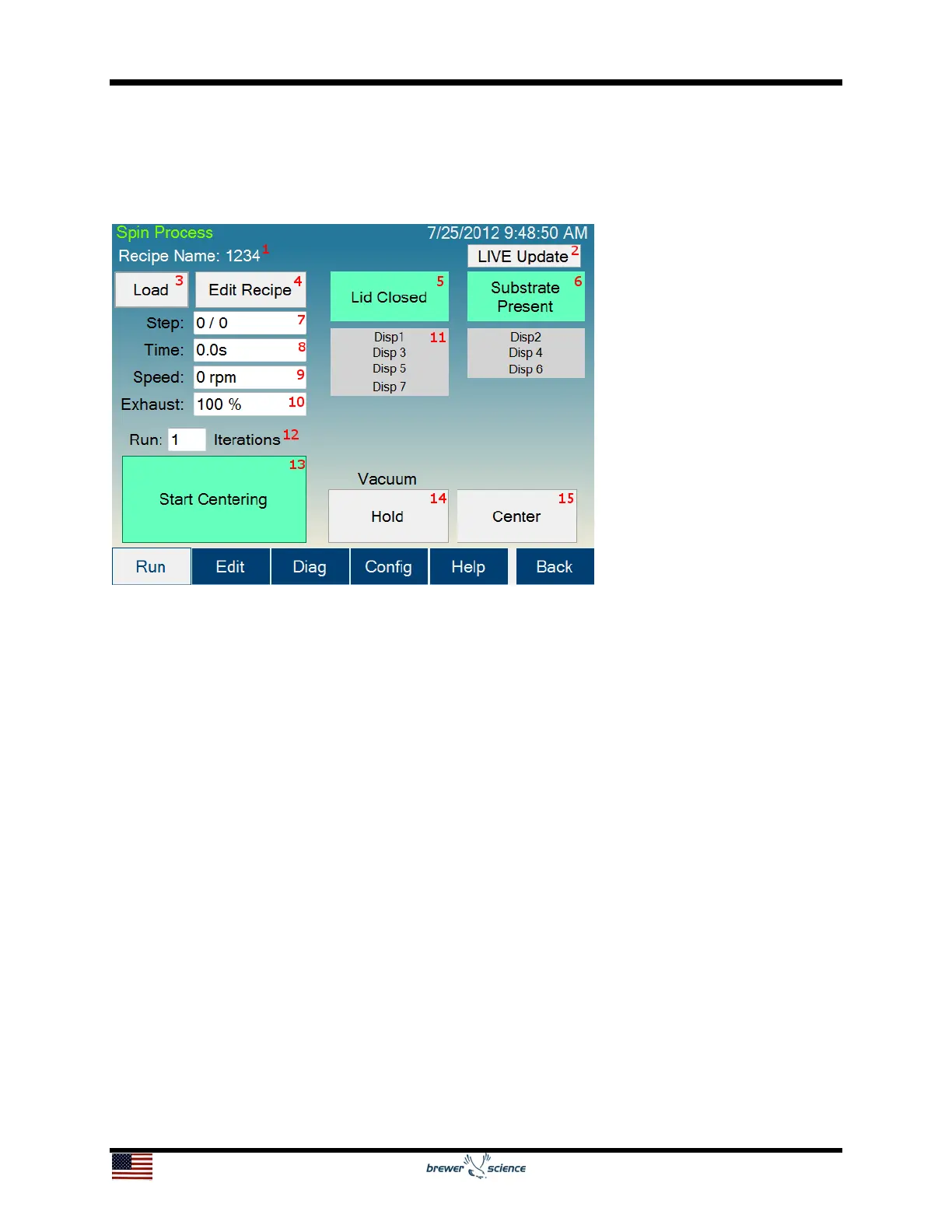 The controls and indicators found on the Spin Process screen are listed below: