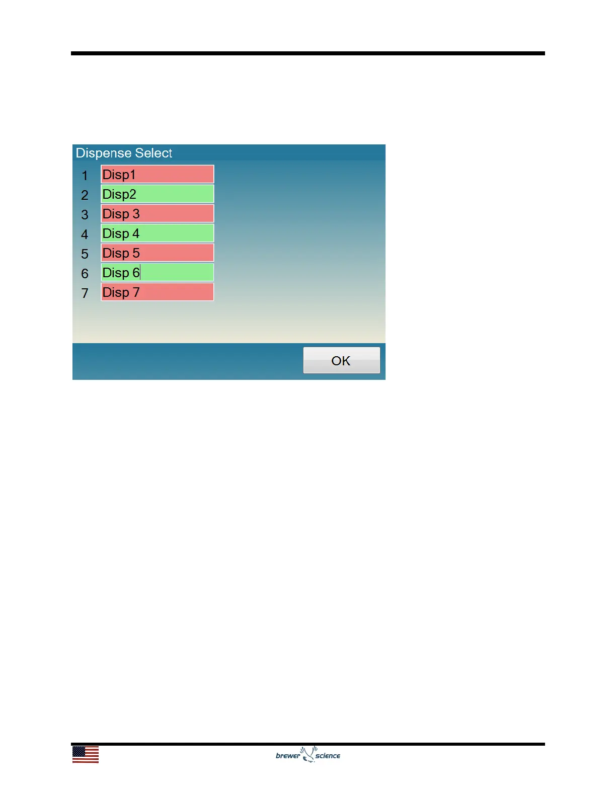 highlighted in green, and dispenses that will remain off will be highlighted in red. There