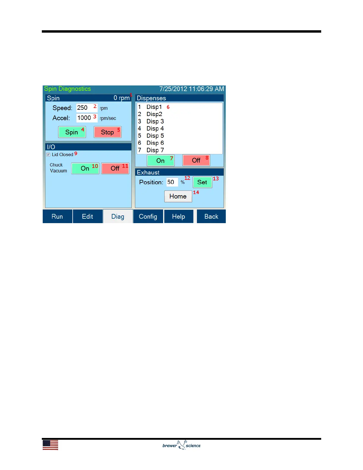The Spin Diagnostics screen allows manual operation of most of the hardware on the