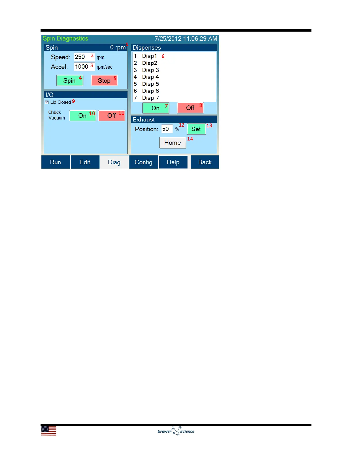 14. Exhaust Home button: Causes the exhaust to re-initialize to its home sensor.