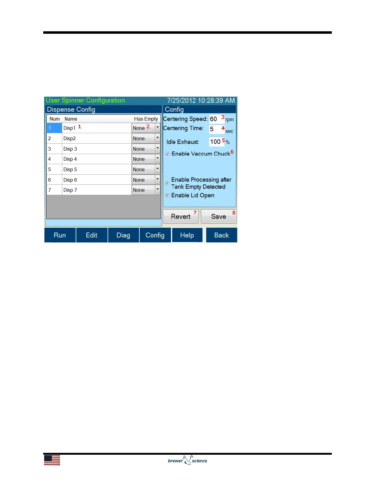 The User Spinner Configuration Screen allows the user to set parameters for the