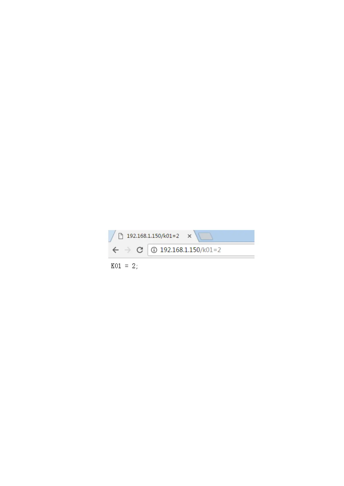 http://192.168.1.105/k01=2. Relay channel 1 will be toggled, and a message will be returned to
