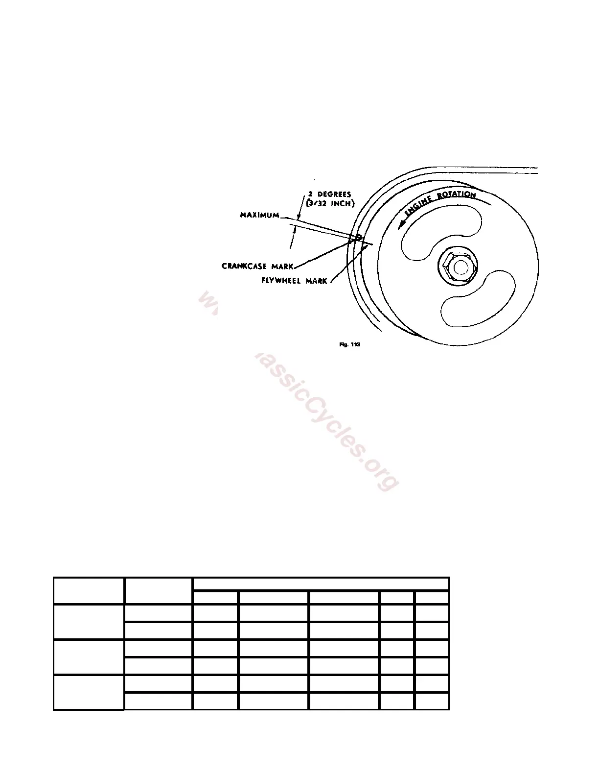 The ignition mark is 3/32" below the center of the stationary mark, (See Fig. 113)