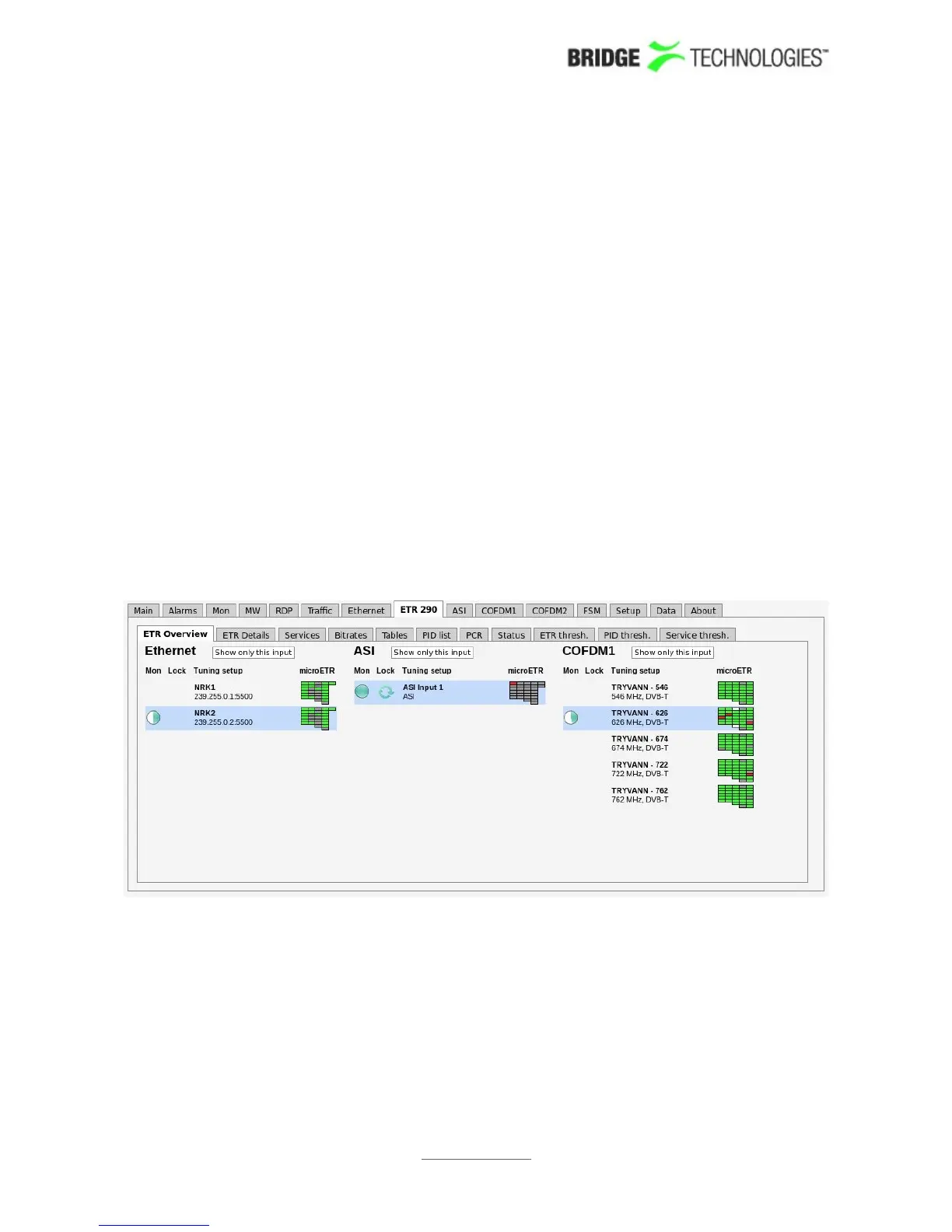 The ETR 290 - ETR Overview view will show ETR 290 status for ETR 290 monitored