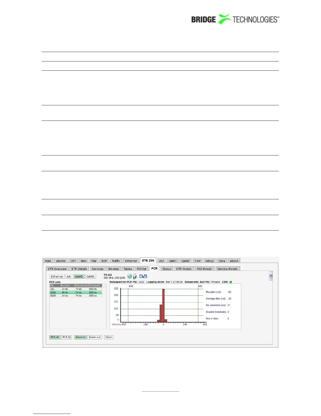 The PCR jitter histogram displays PCR jitter as measured by the probe.