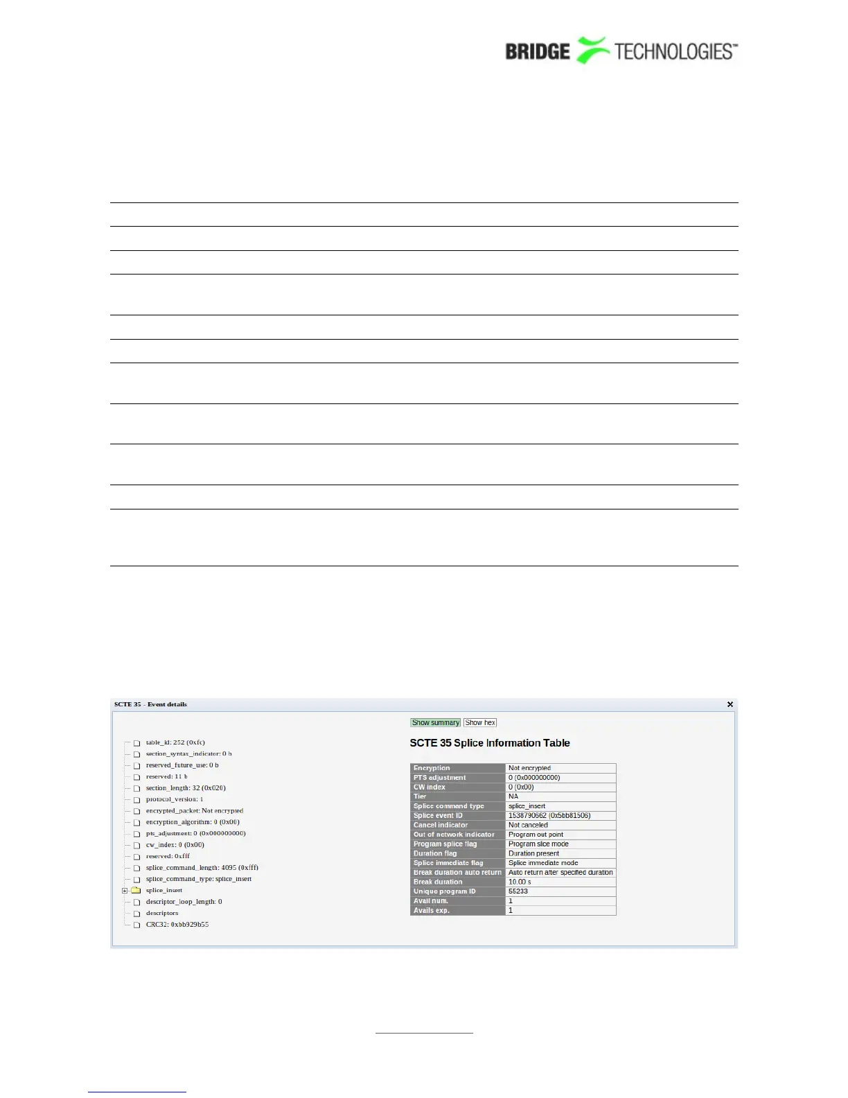 with detailed information about the event. The popup will show a log of the SCTE 35