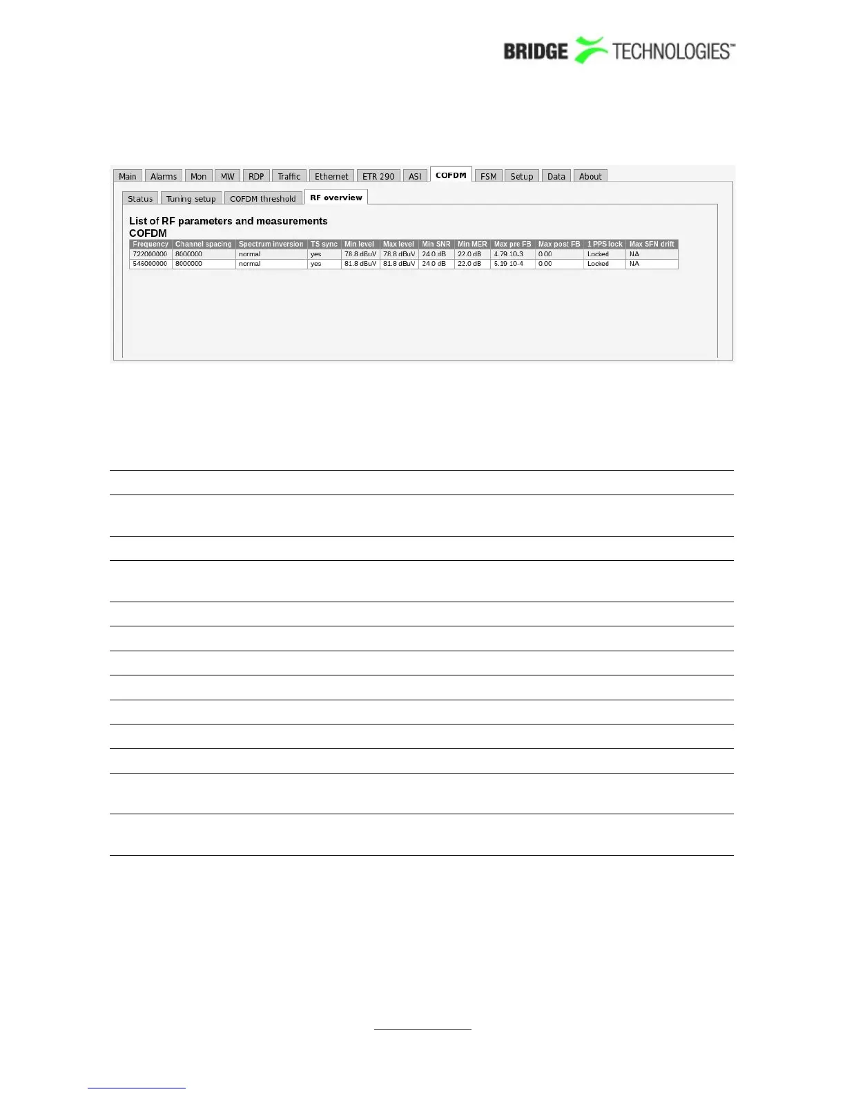 COFDM frequencies from the selected RF input. The parameters and measurements in