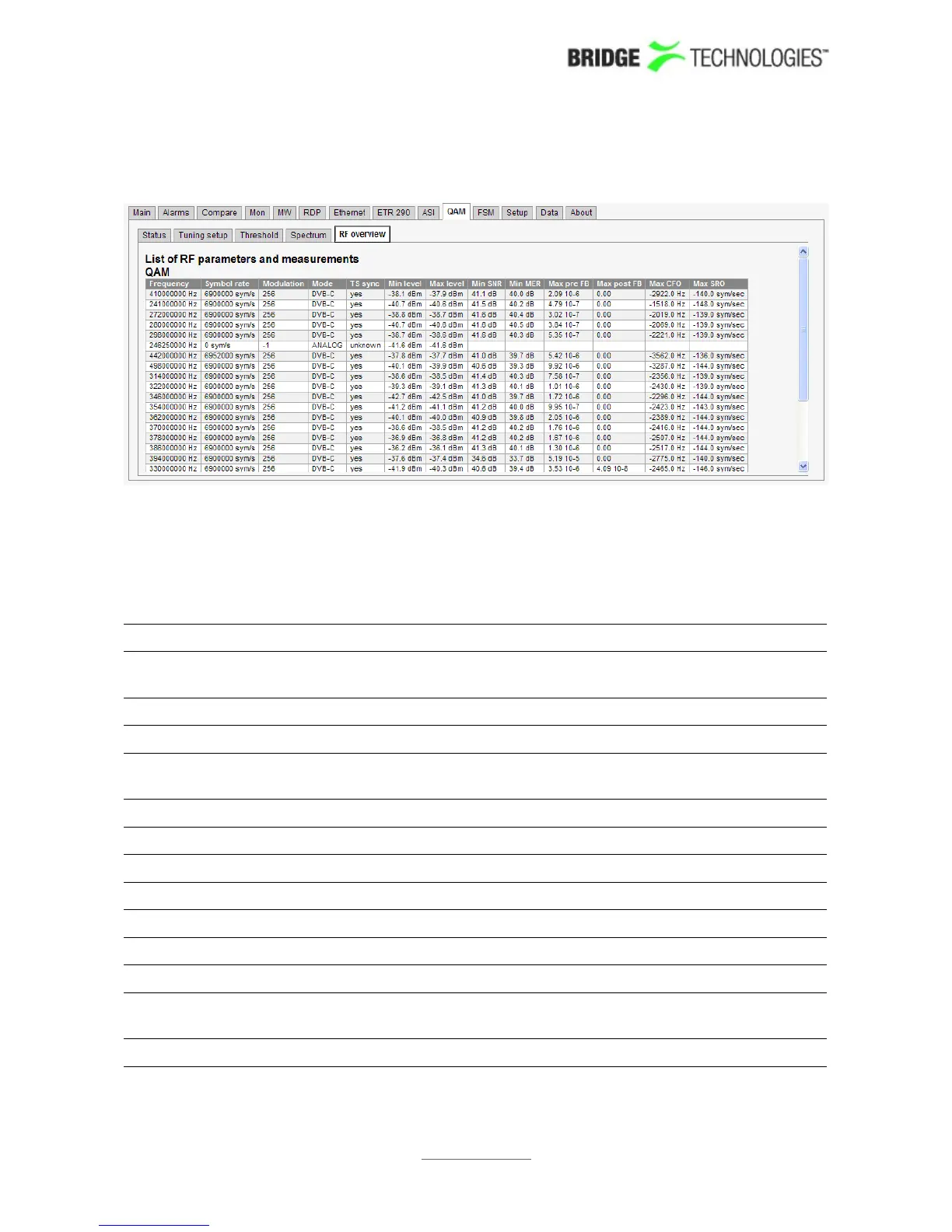 QAM frequencies from the selected RF input. The parameters and measurements in