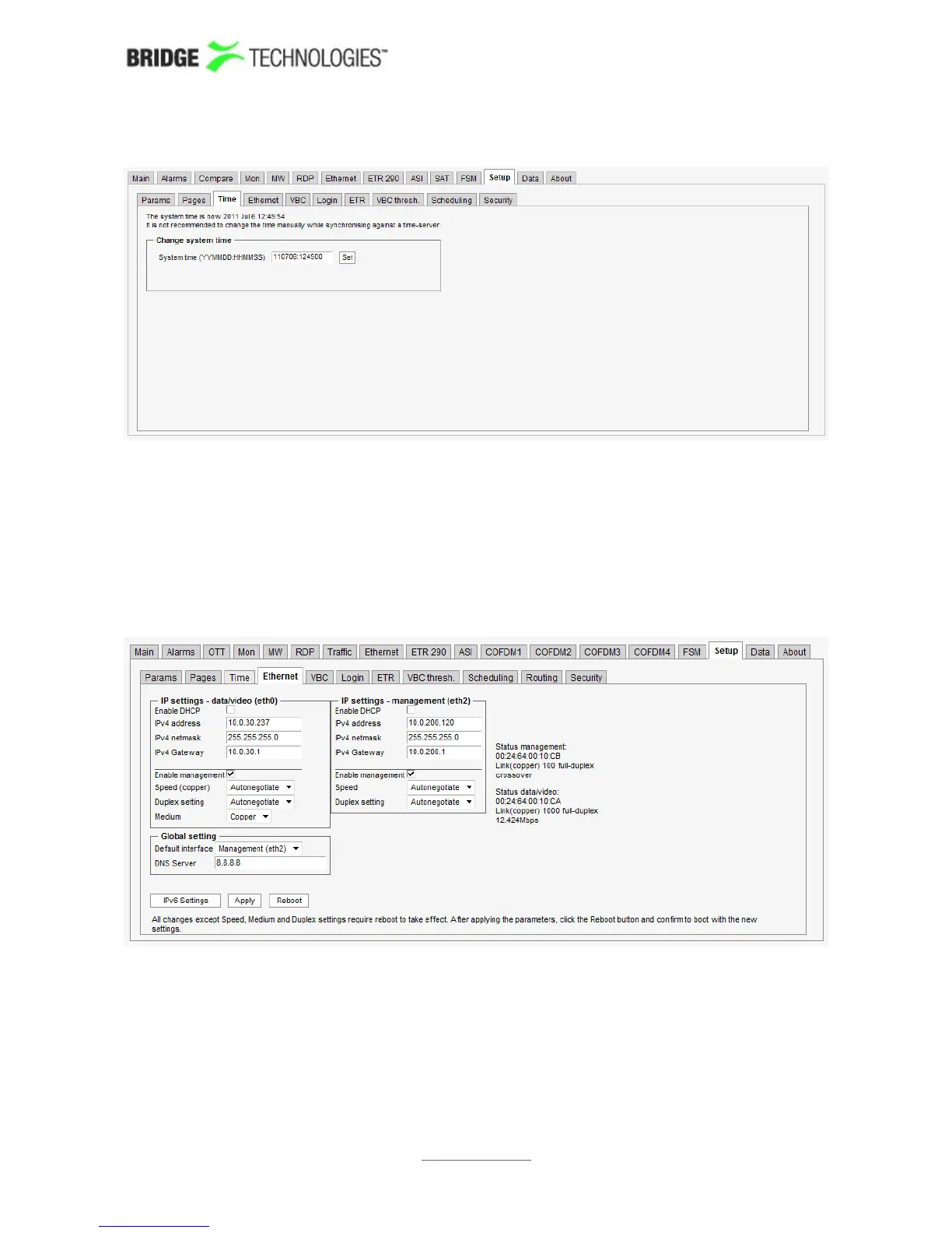 The Ethernet setup menu defines the Ethernet setup parameters for the management