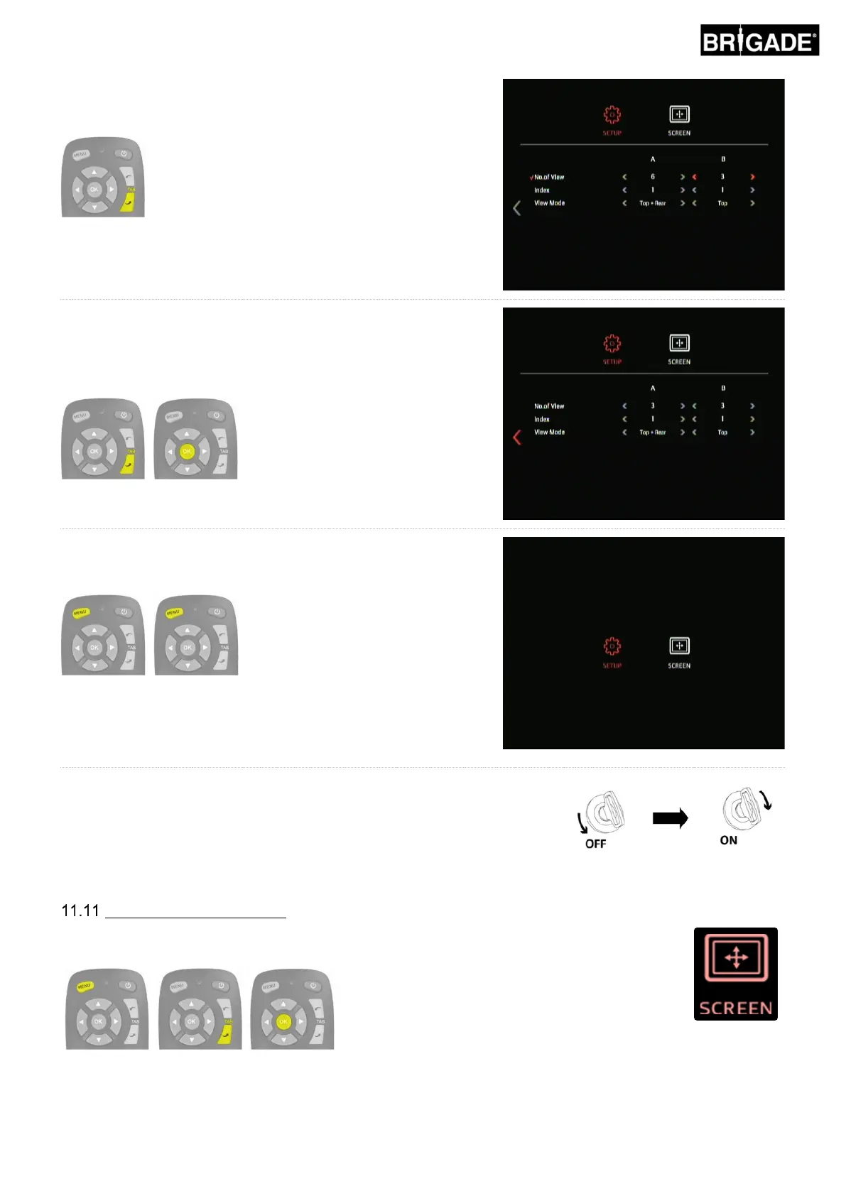 To change the display settings enter the SCREEN menu by pressing MENU button, and pressing