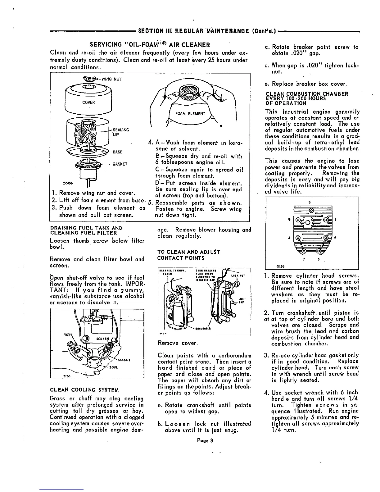 Briggs & Stratton 19D - Servicing Oil-Foam Air Cleaner; Draining Fuel Tank; Cleaning Fuel Filter; To Clean and Adjust Contact Points