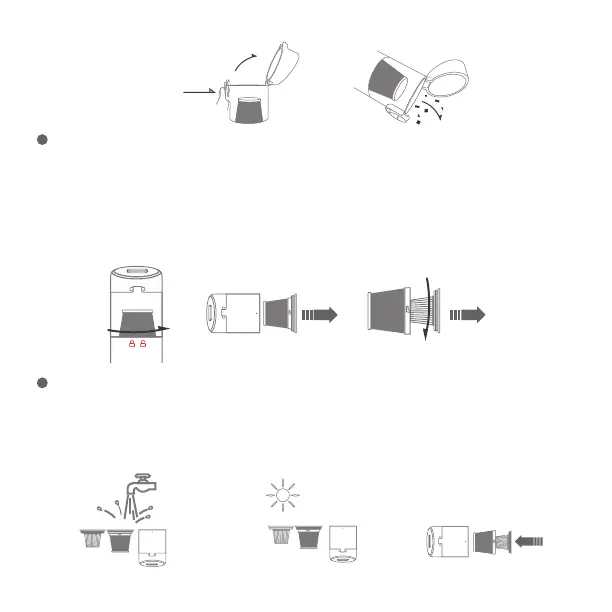 按箭頭方向旋轉打開塵杯,取出濾網組件;按箭頭方向旋轉高性能濾芯並取出