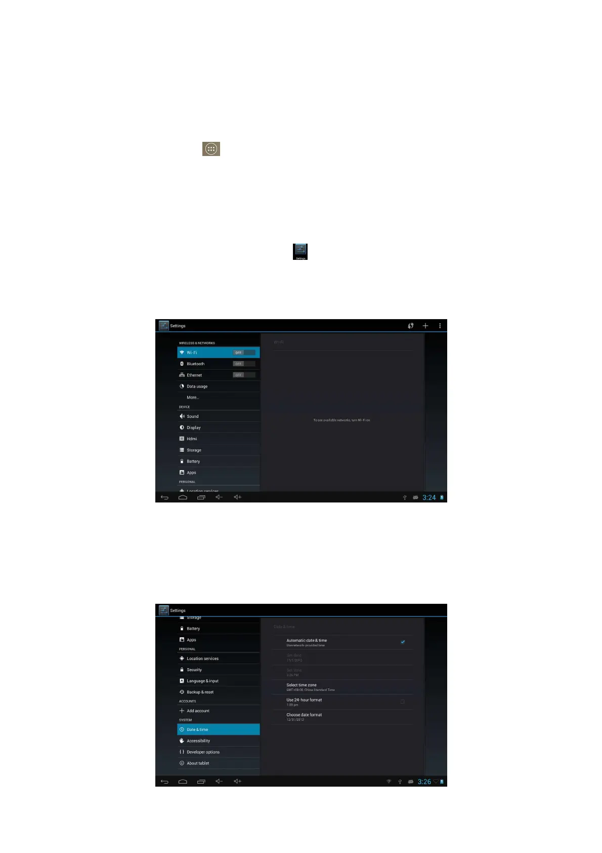 hora. Usted puede configurar la fecha, la zona horaria, la hora, el formato de hora y