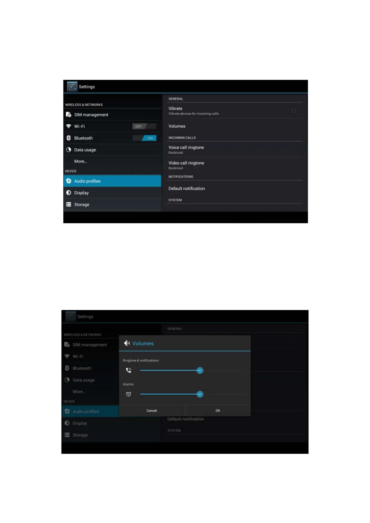 In picture 4.27, click volume, you can set ringtone, notice, and alarm