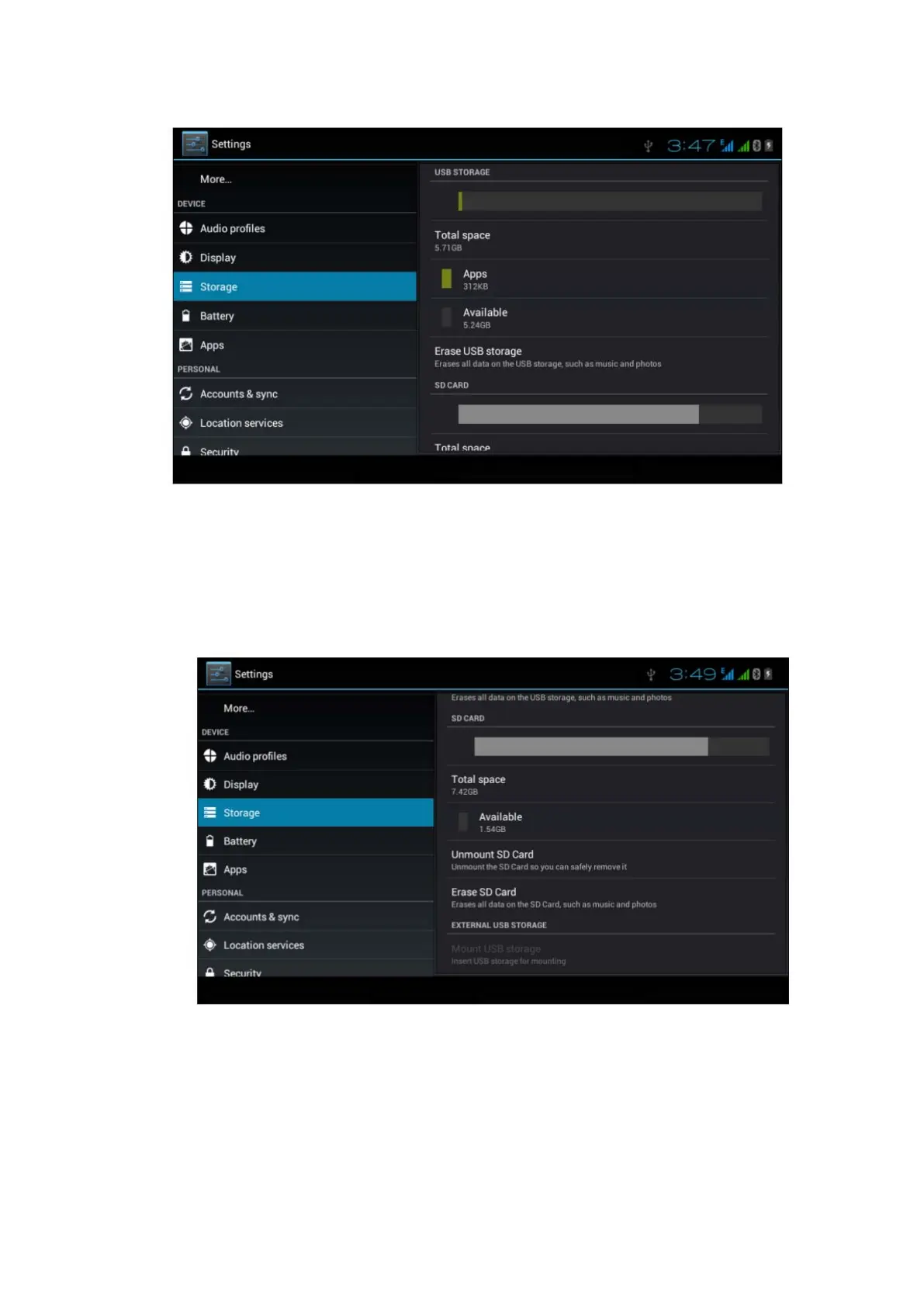 You can check storage space, SD card available space, unmount SD