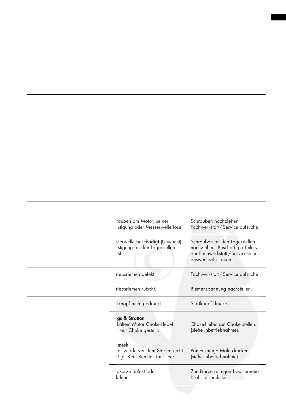 Fachwerkstatt/Service aufsuchen.Antriebsriemen defekt.Messerwalze läuft nicht mit.