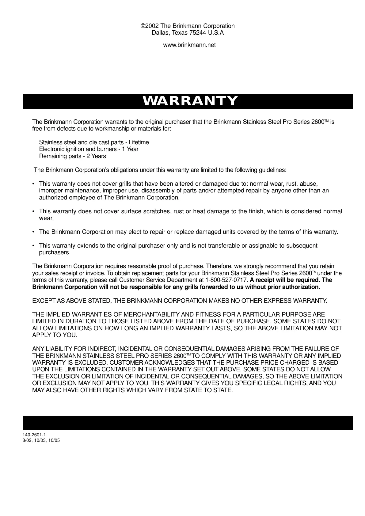 The Brinkmann Corporation’s obligations under this warranty are limited to the following guidelines: