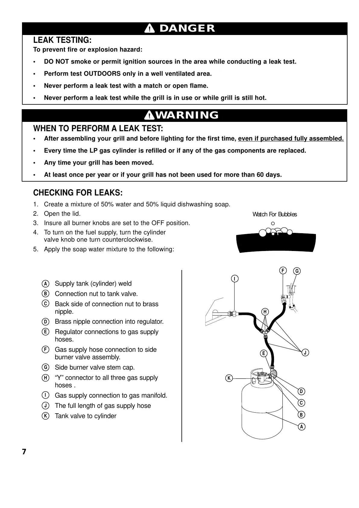 • Never perform a leak test while the grill is in use or while grill is still hot.