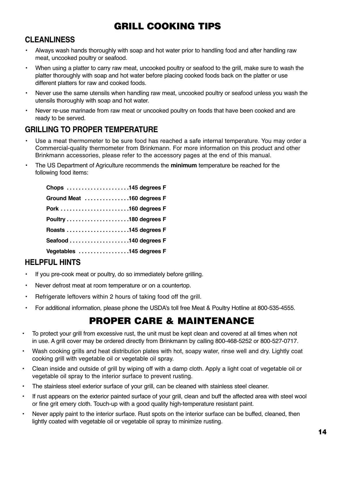in use. A grill cover may be ordered directly from Brinkmann by calling 800-468-5252 or 800-527-0717.