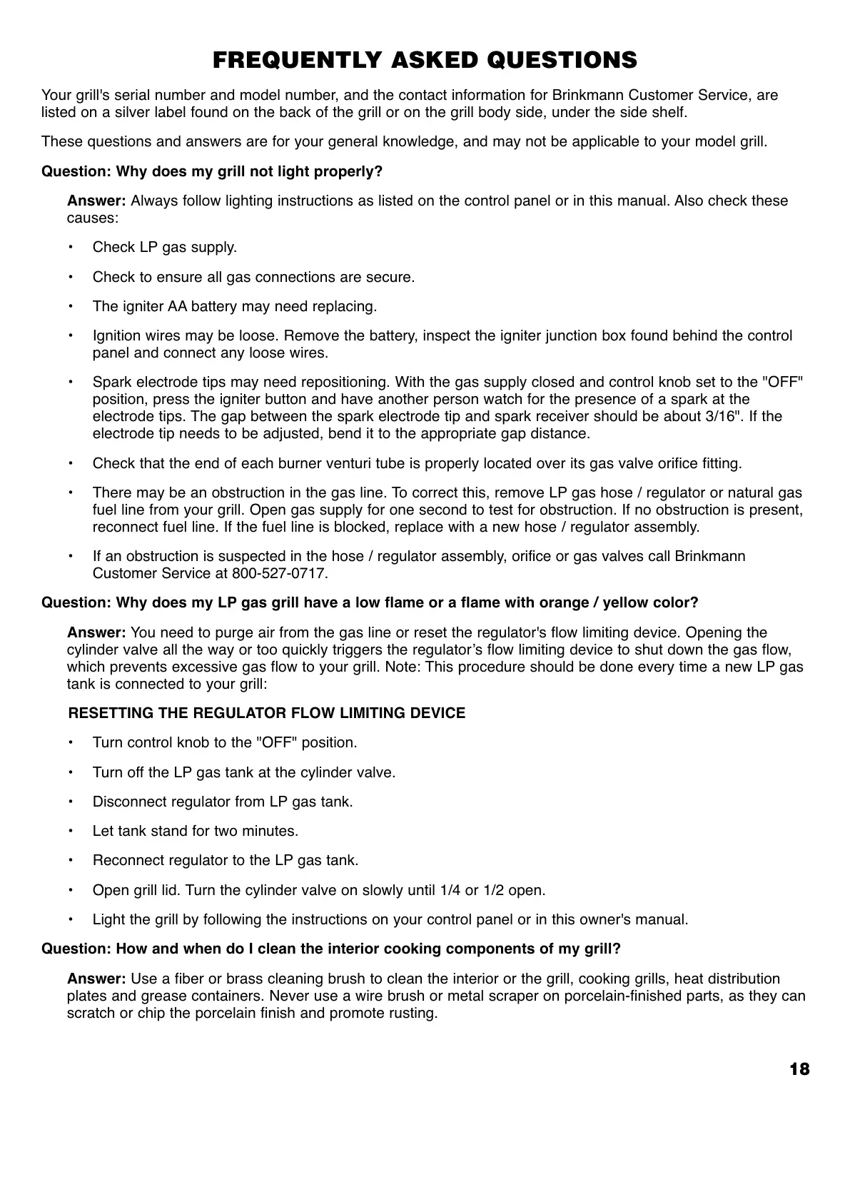 • If an obstruction is suspected in the hose / regulator assembly, orifice or gas valves call Brinkmann