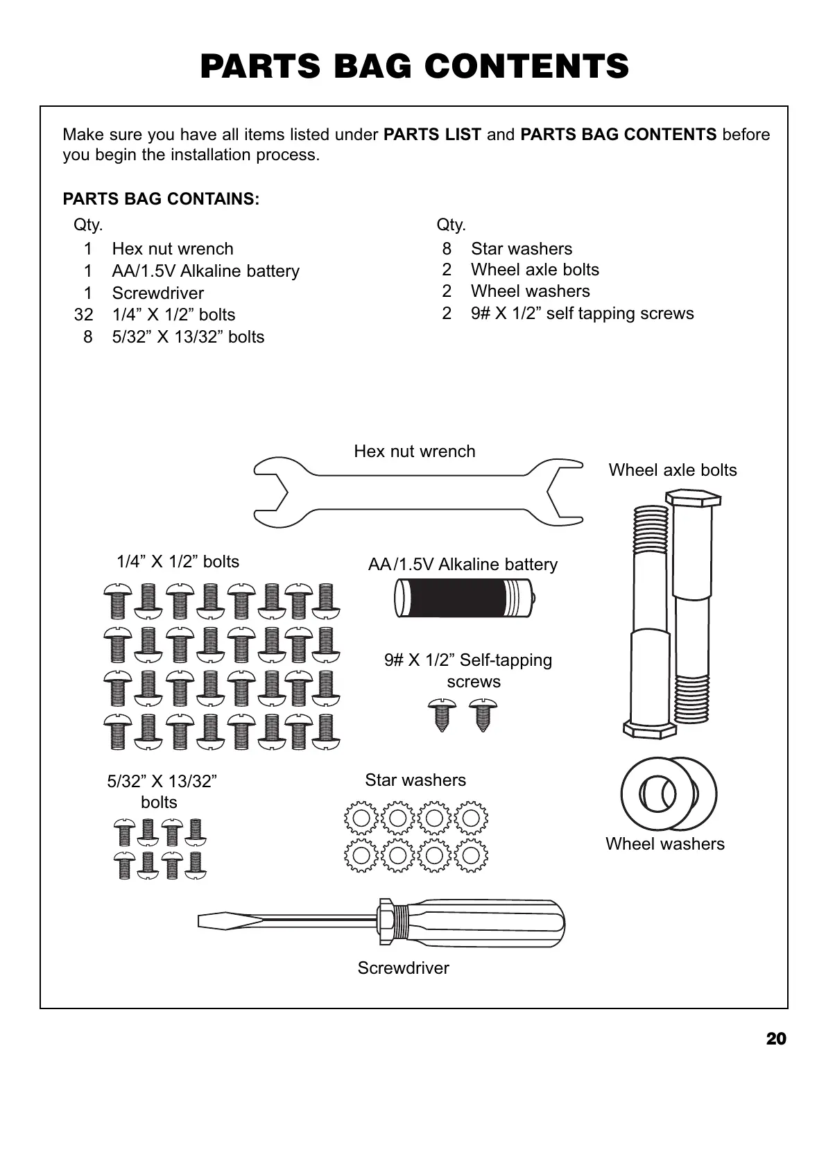 Make sure you have all items listed under PARTS LIST and PARTS BAG CONTENTS before