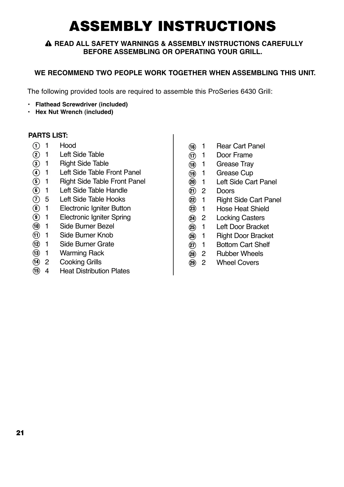 The following provided tools are required to assemble this ProSeries 6430 Grill: