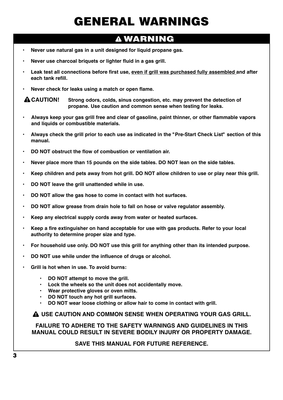 • Leak test all connections before first use, even if grill was purchased fully assembled
