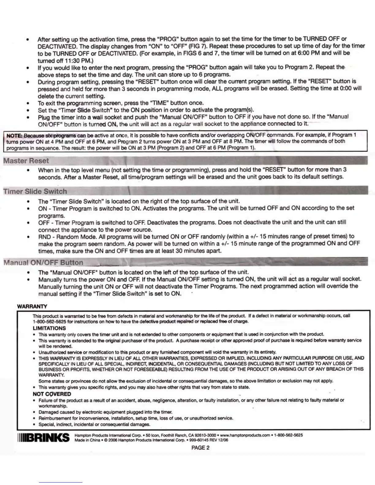 BRINKS 44-1020 - Managing Programs and Exiting; Timer Operation Modes; Timer Slide Switch Function; Manual ON;OFF Button