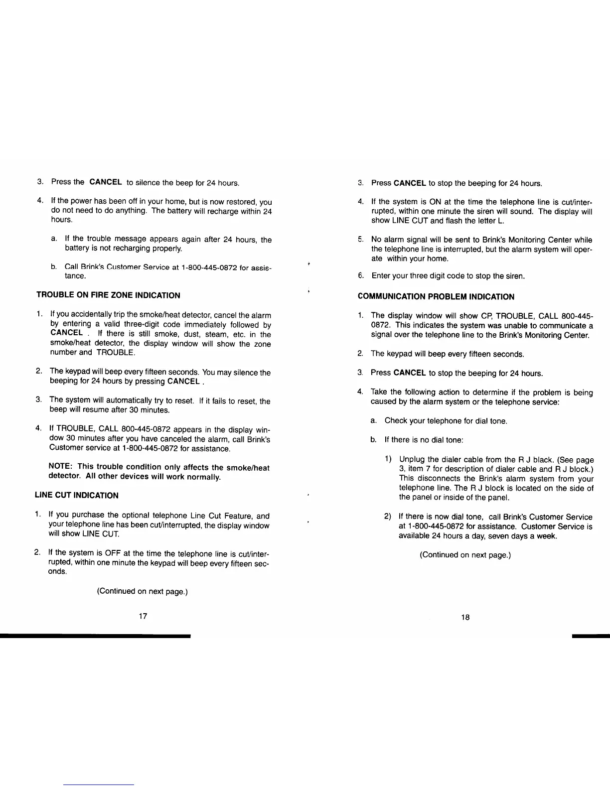 BRINKS BHS-2000 - TROUBLE ON FIRE ZONE INDICATION; LINE CUT INDICATION; COMMUNICATION PROBLEM INDICATION