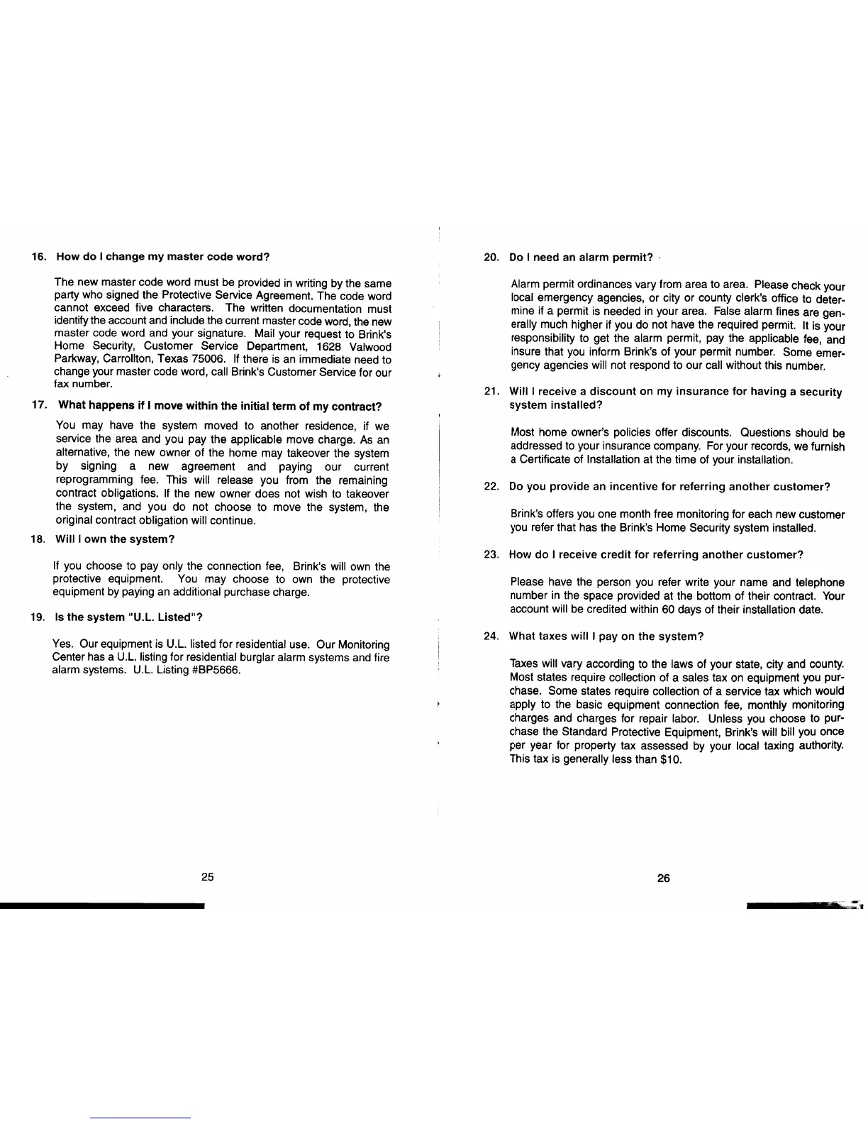 BRINKS BHS-2000 - Do I need an alarm permit?; Will I receive a discount on my insurance for having a security system installed?; Do you provide an incentive for referring another customer?; How do I receive credit for referring another customer?