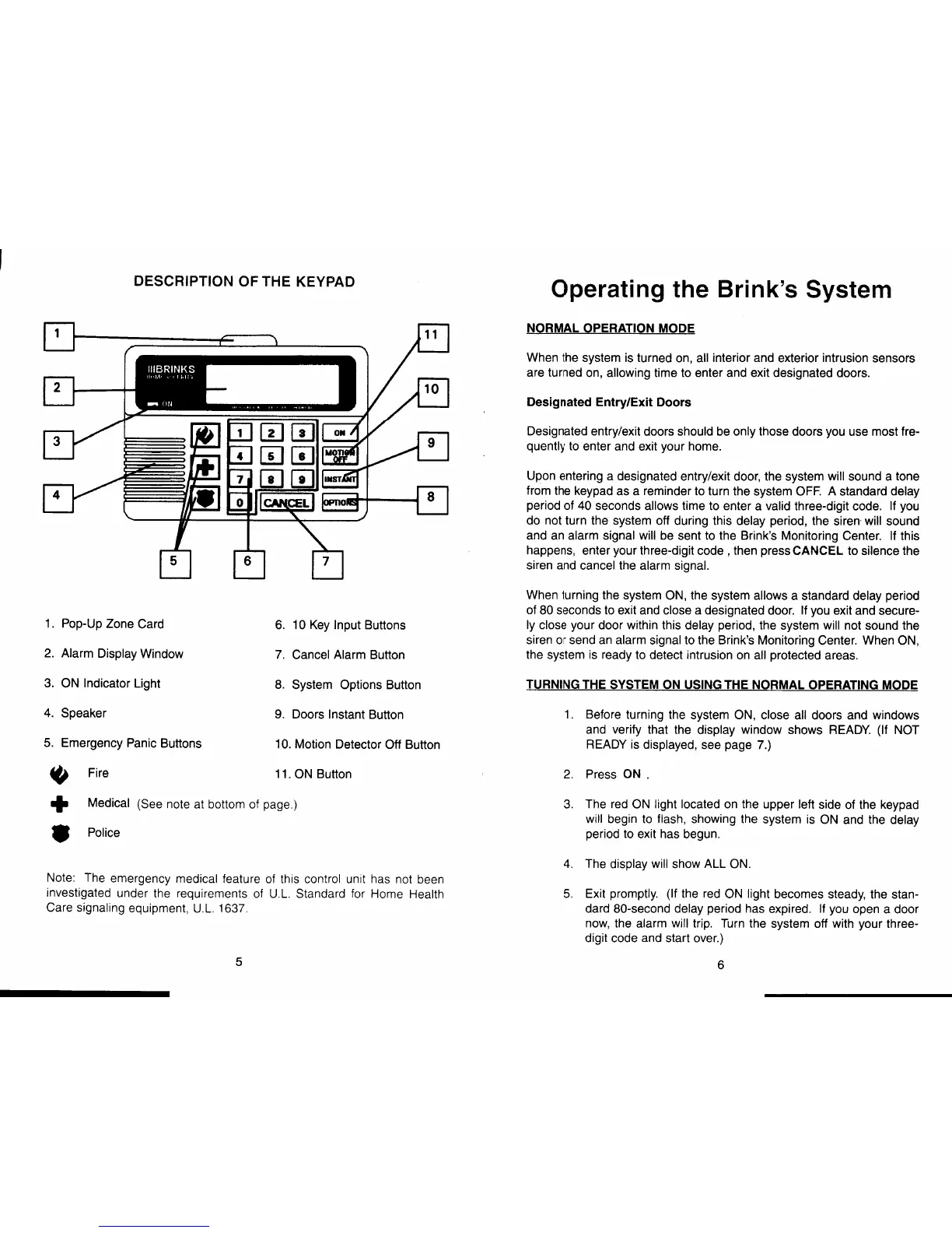 BRINKS BHS-2000 - Description of the Keypad; Operating the Brinks System; Normal Operation Mode; Designated Entry;Exit Doors