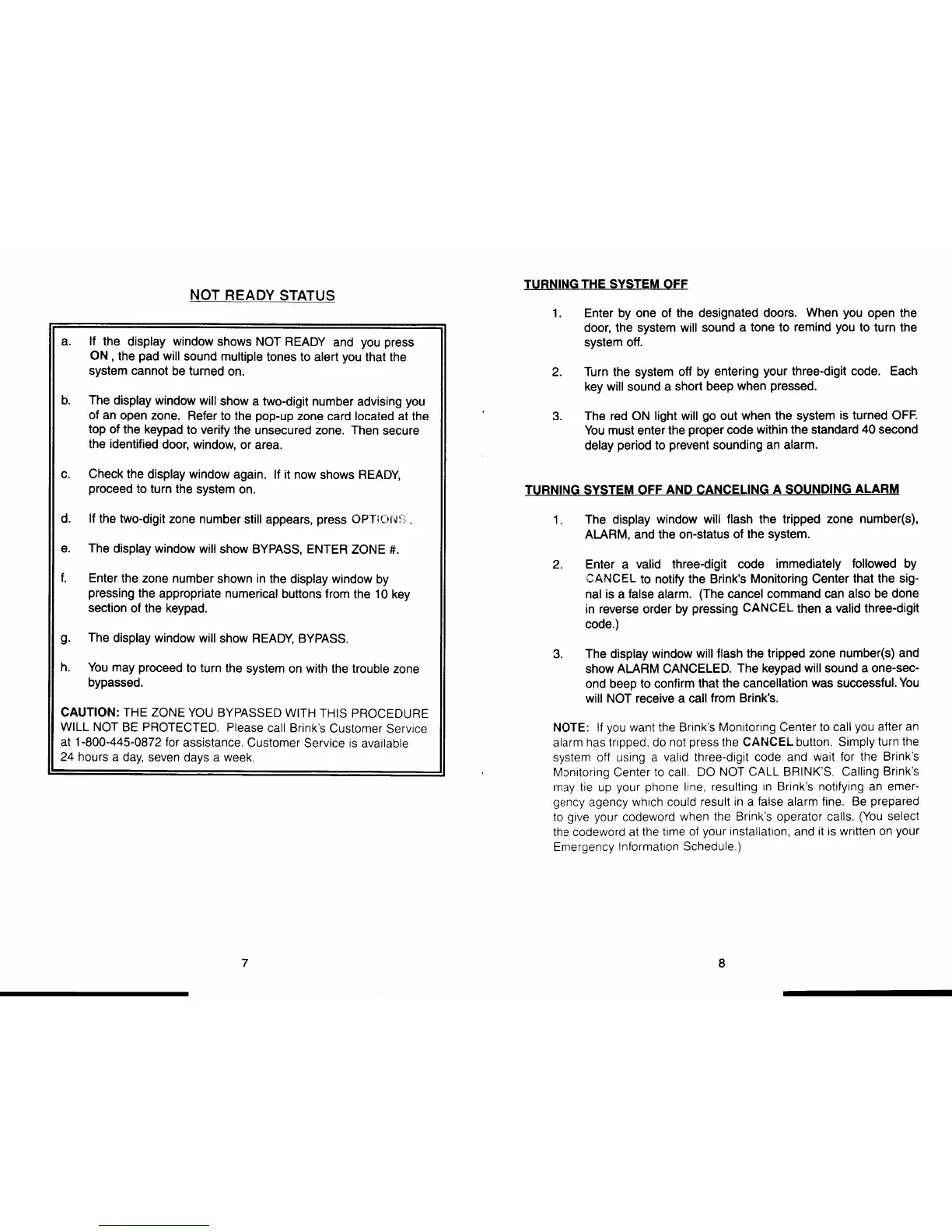 BRINKS BHS-2000 - Not Ready Status; Turning the System OFF; Turning System OFF and Canceling a Sounding Alarm