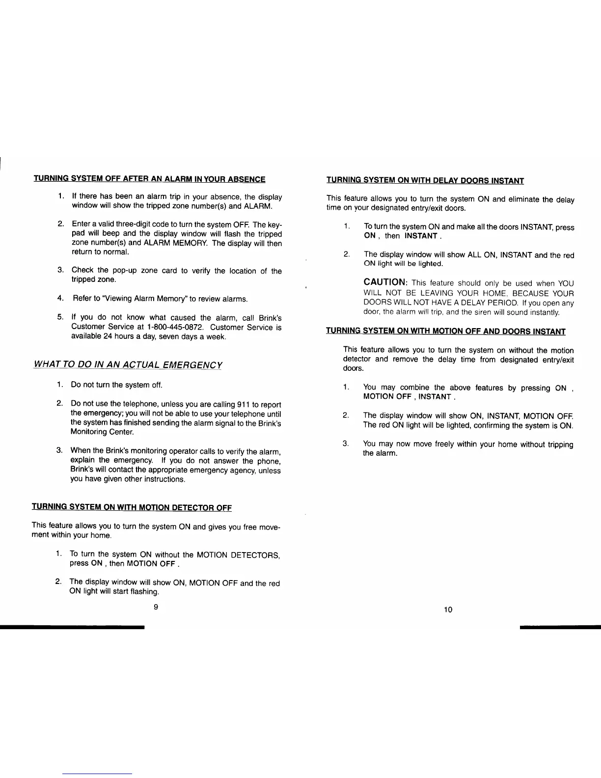 BRINKS BHS-2000 - Turning System OFF After an Alarm in Your Absence; What to do in an Actual Emergency; Turning System ON with Motion Detector Off; Turning System ON with Delay Doors Instant