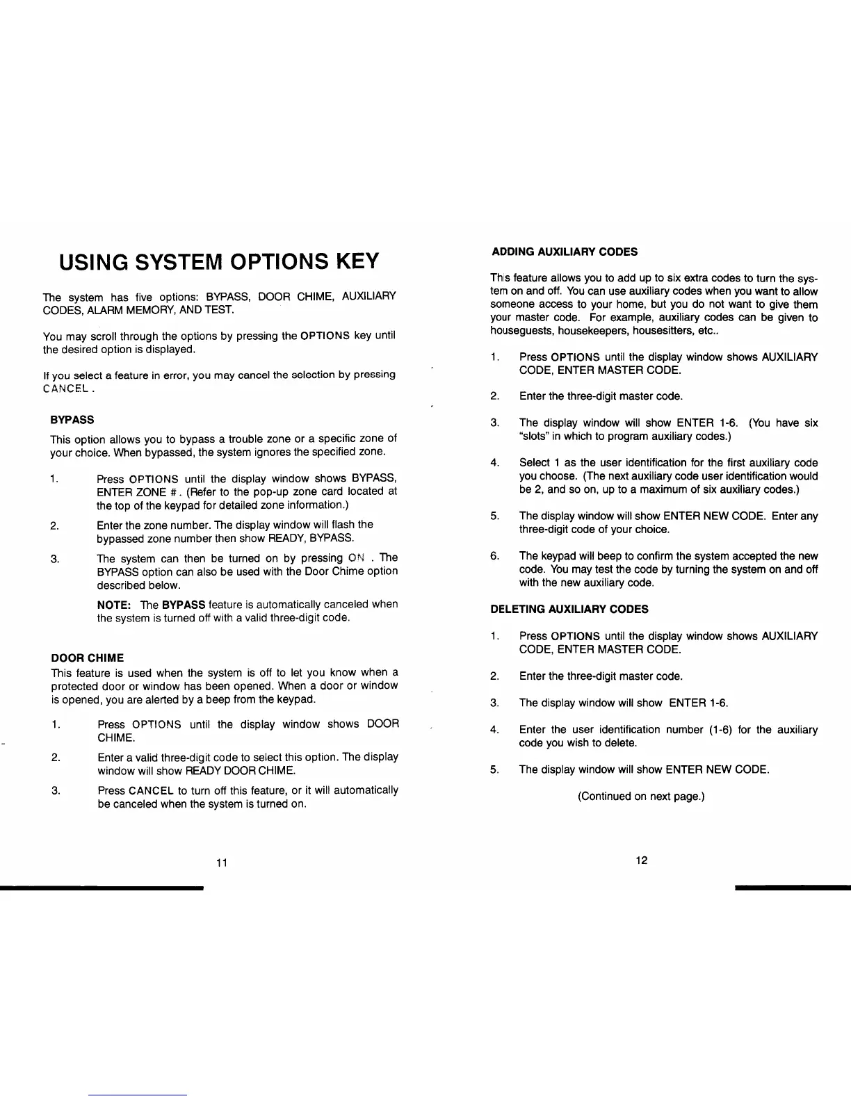 BRINKS BHS-2000 - Using System Options Key; BYPASS; DOOR CHIME; ADDING AUXILIARY CODES