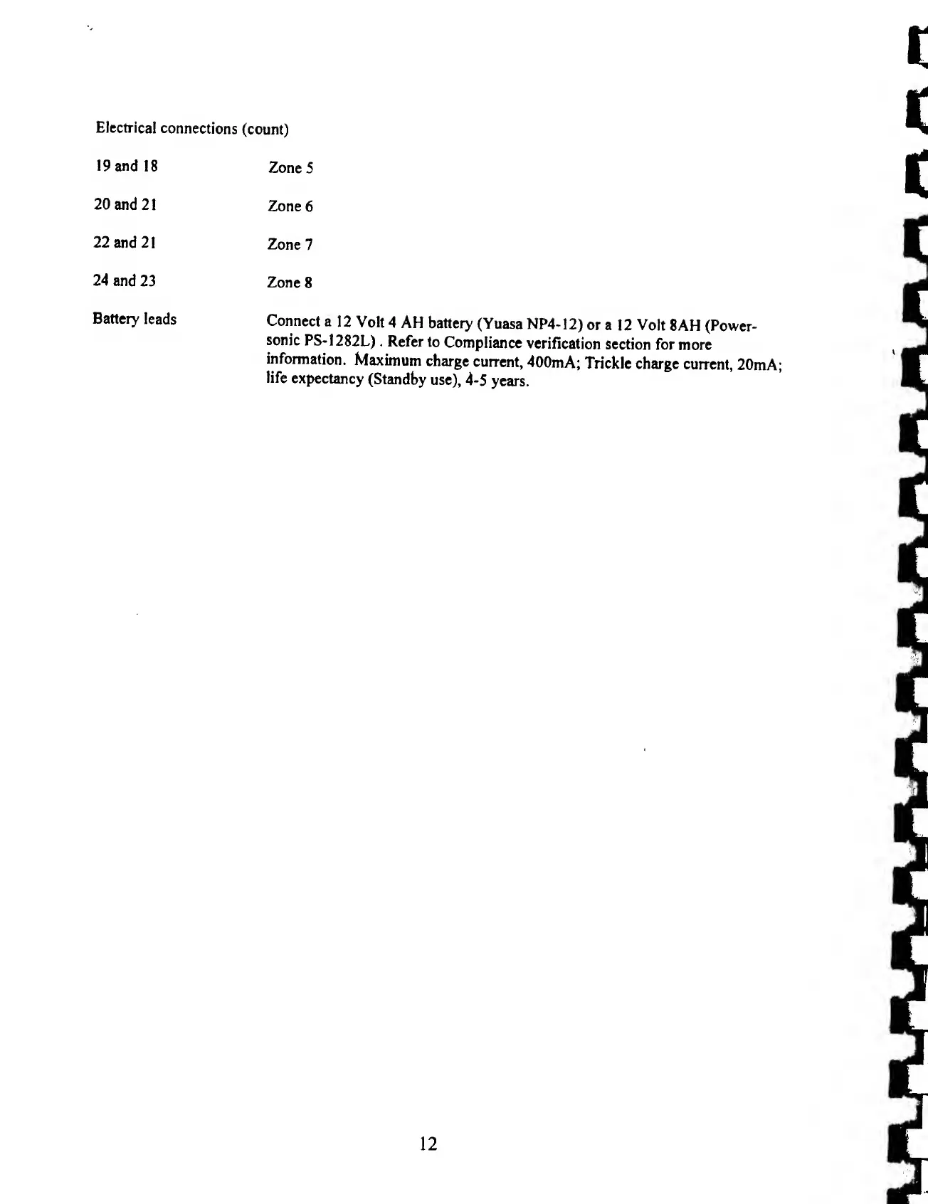 BRINKS BHS 2000A - Electrical Connections (Continued); Zone Wiring Details; Battery Lead Requirements