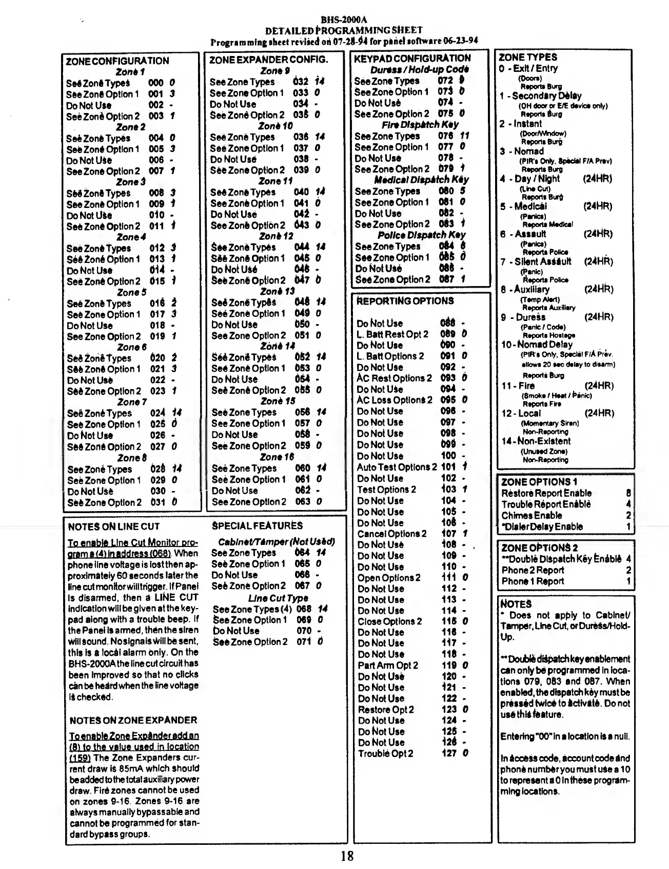 BRINKS BHS 2000A - Detailed Programming Sheet; Zone Configuration and Types; Reporting and Special Features