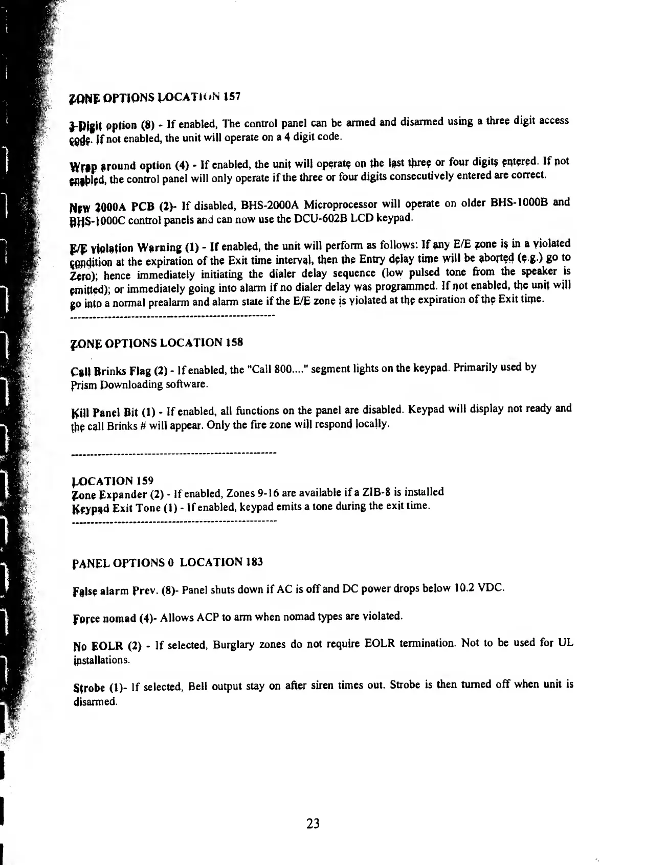 BRINKS BHS 2000A - Zone and Panel Options; Zone Options Locations 157-159; Panel Options Location 183