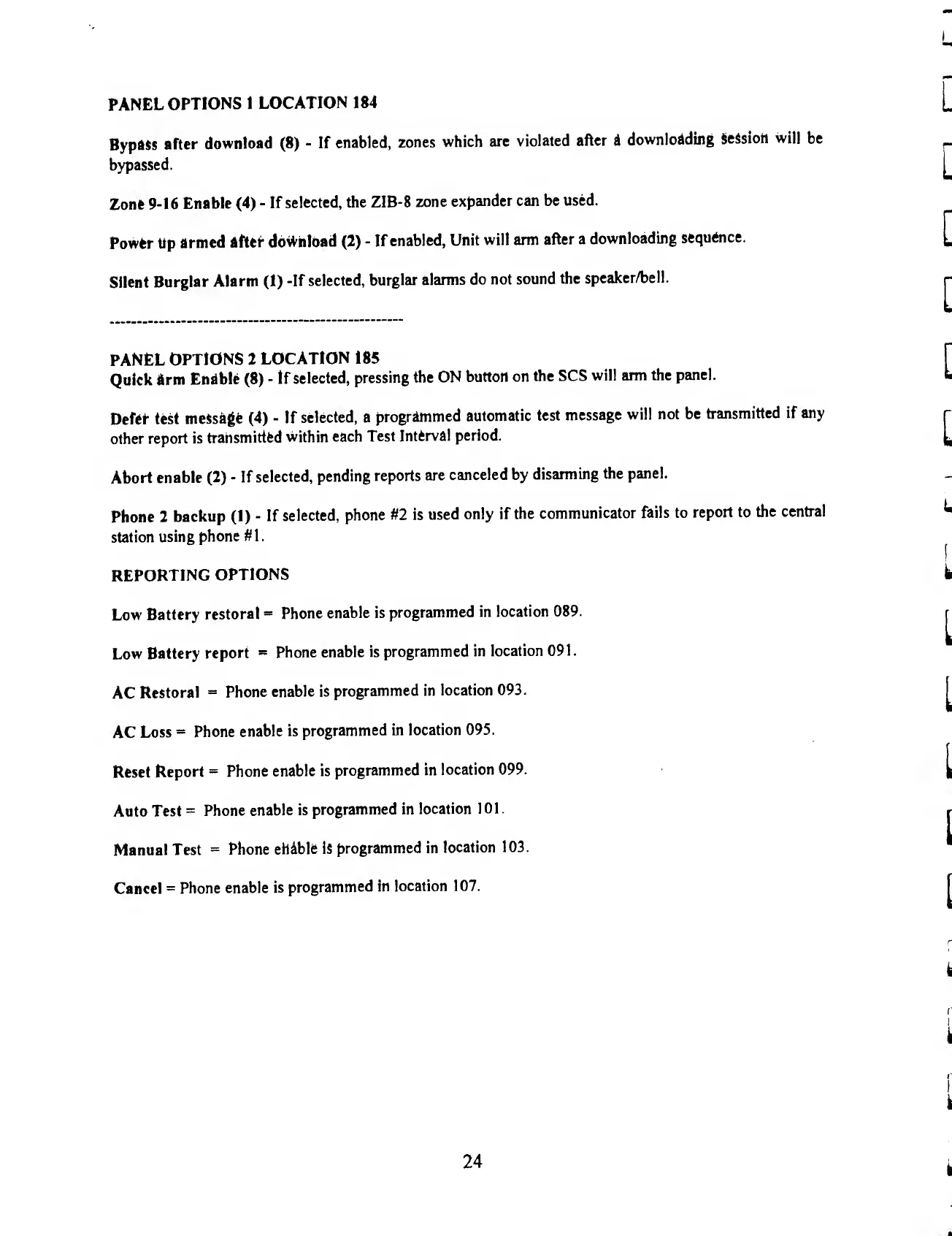 BRINKS BHS 2000A - Panel Options and Reporting; Panel Options Locations 184-185; Reporting Options Settings