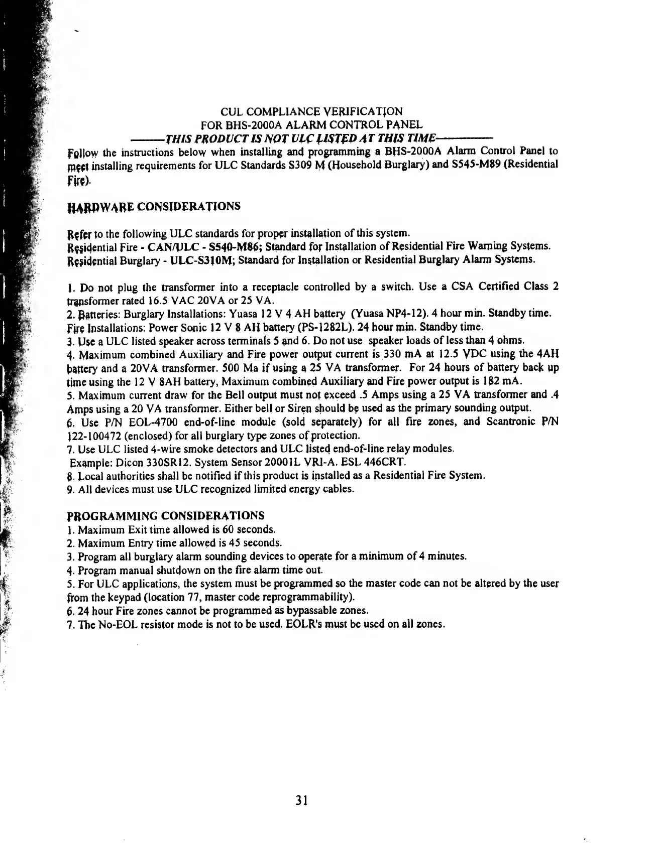 BRINKS BHS 2000A - CUL Compliance Verification; Hardware Considerations; Programming Considerations