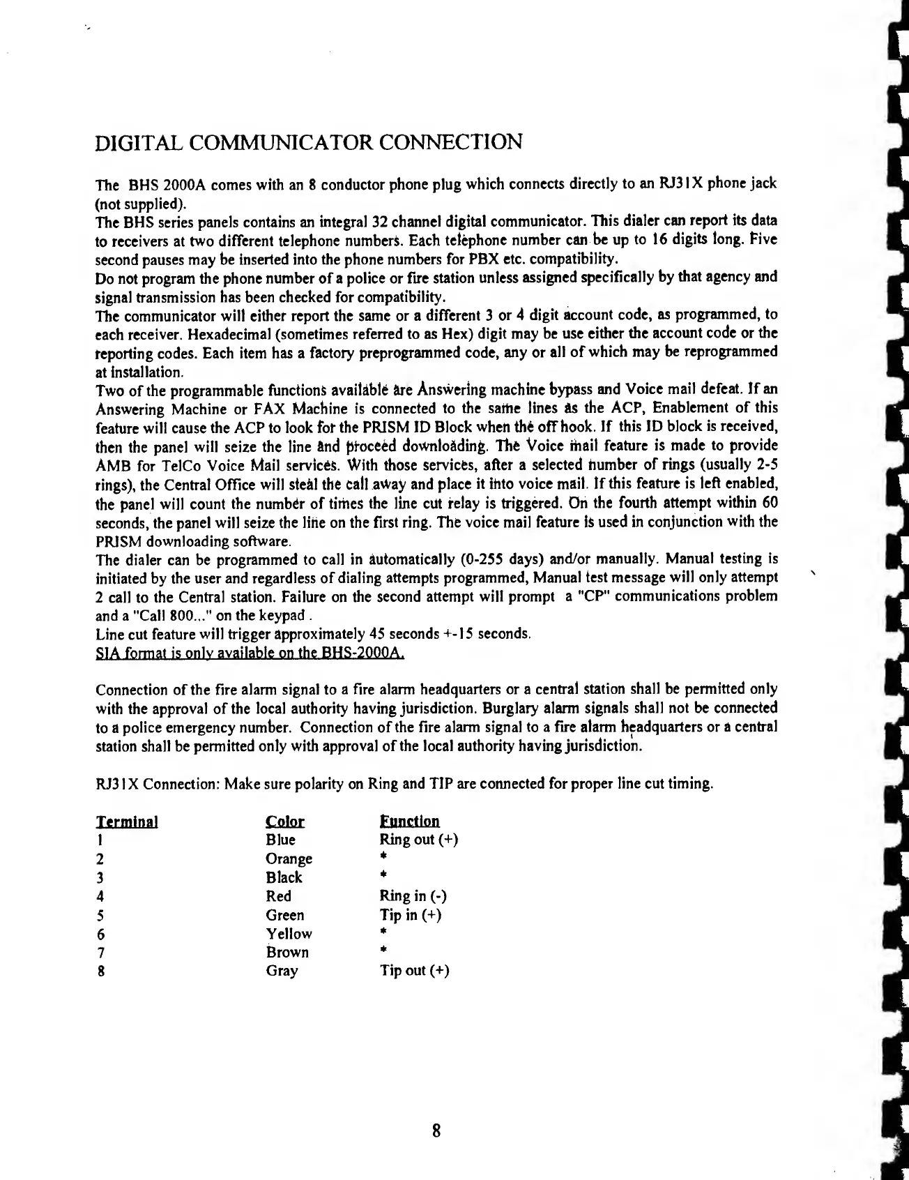 BRINKS BHS 2000A - Digital Communicator; Dialer Features and Programming; RJ31 X Connection Details