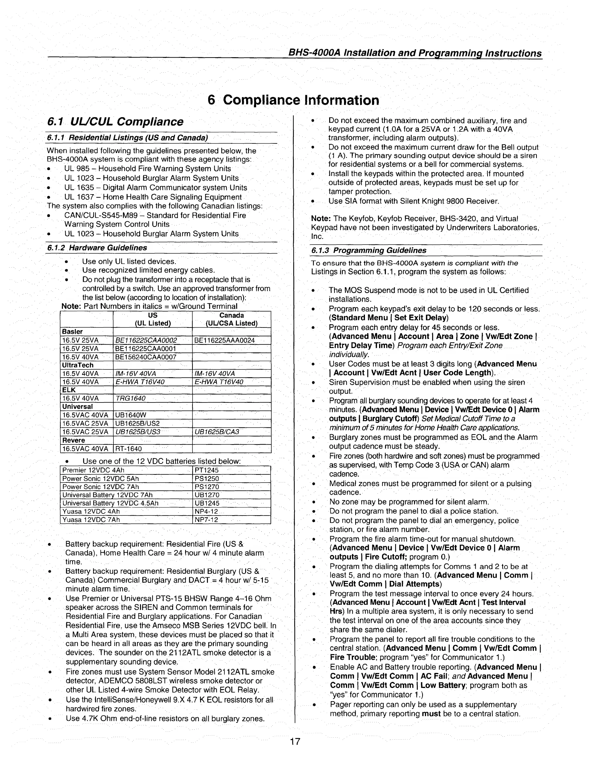 BRINKS BHS-4000A - 6 Compliance Information; 6.1 UL;CUL Compliance; 6.1.1 Residential Listings (US and Canada); 6.1.2 Hardware Guidelines