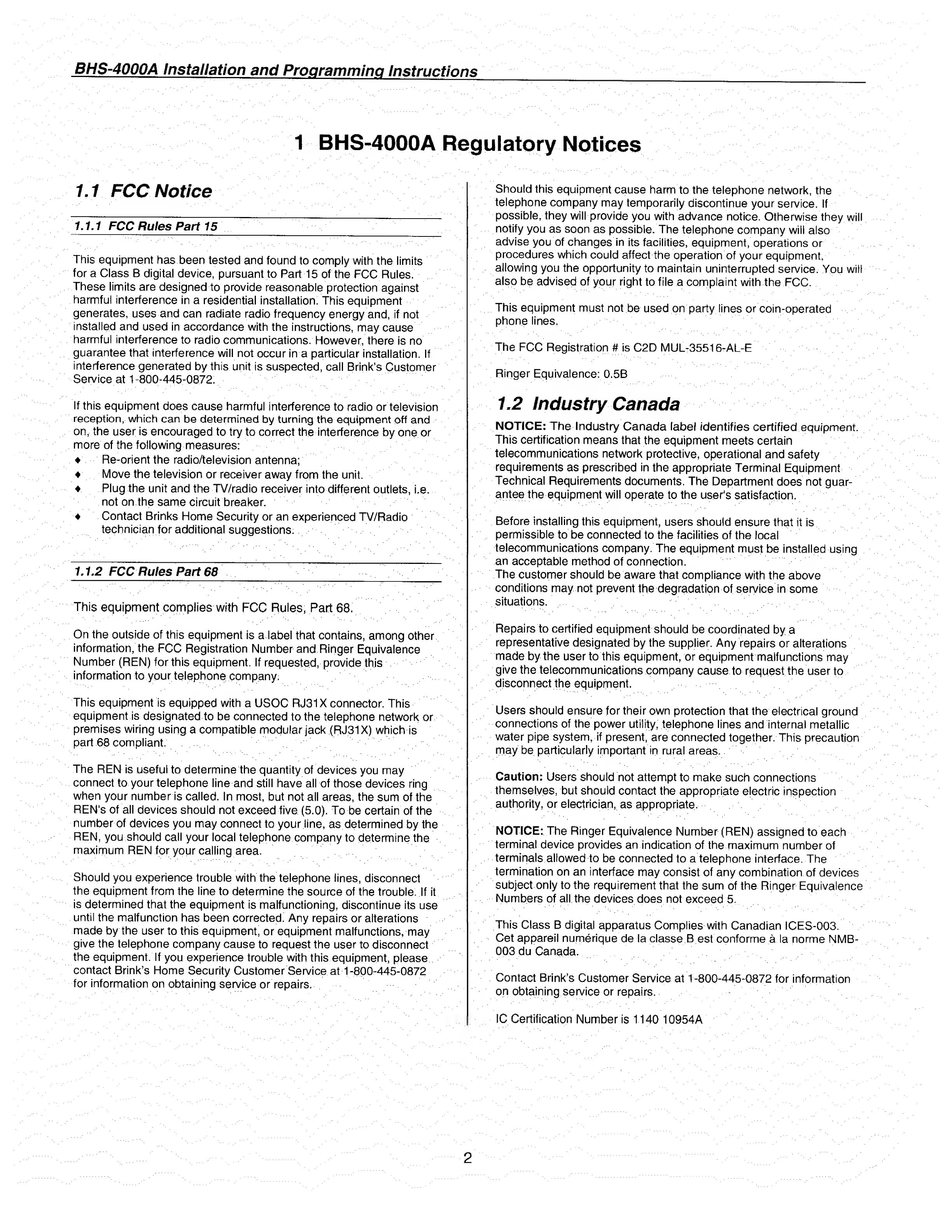 BRINKS BHS-4000A - BHS-4000 A Regulatory Notices; 1.1 FCC Notice and Rules; 1.2 Industry Canada Compliance
