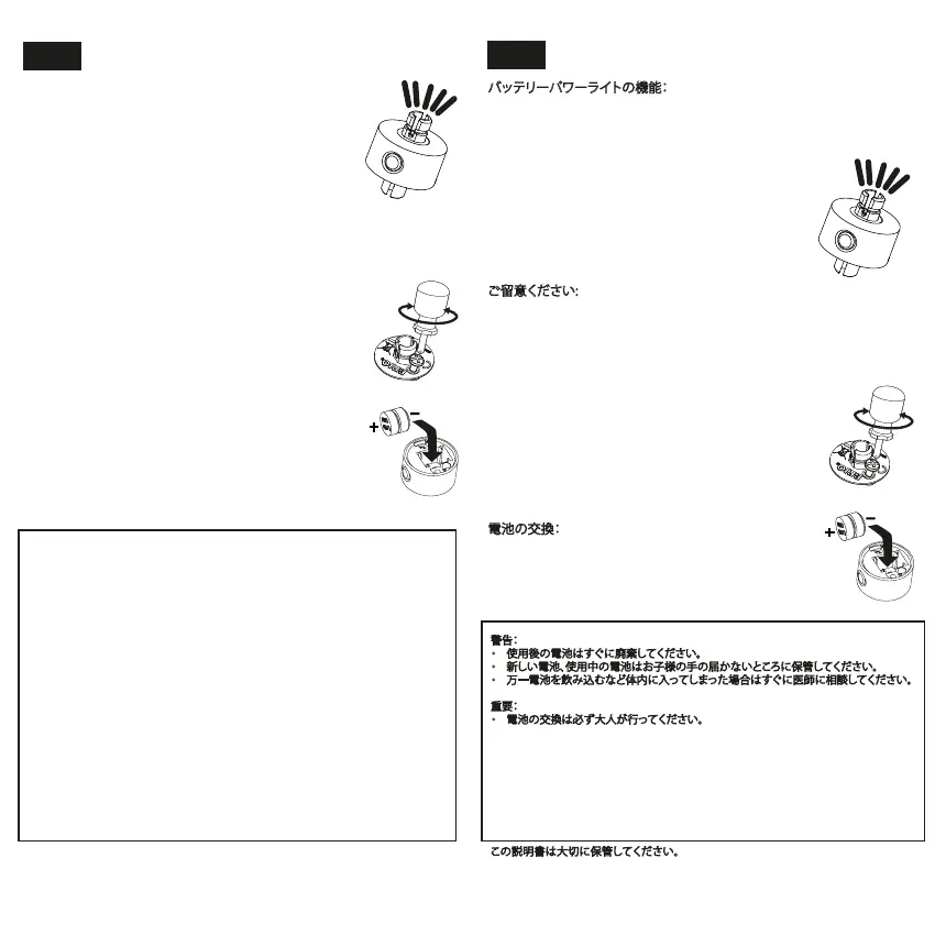 ・ 万一電池を飲み込むなど体内に入ってしまった場合はすぐに医師に相談してください。