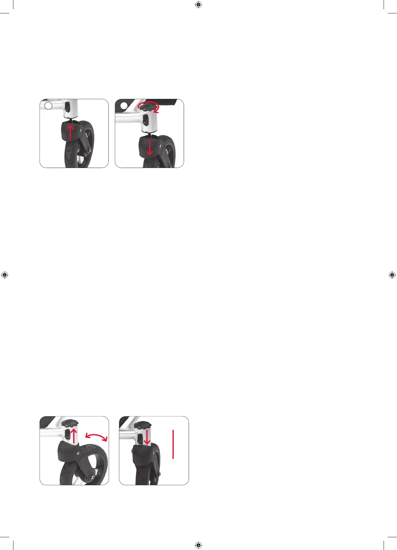 Med swivellåset i det övre läget är framhjulen svängbara, när spärren förs