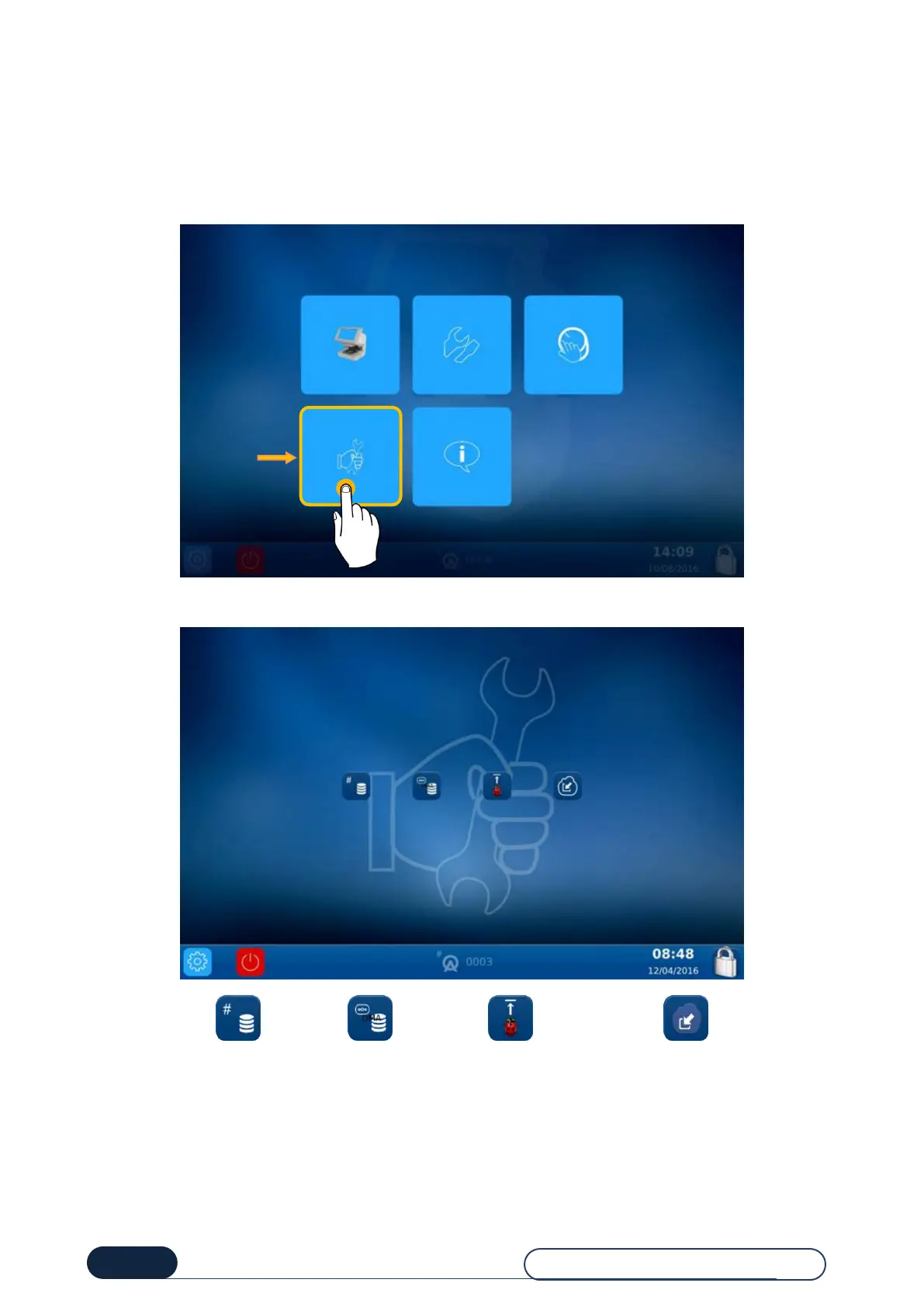 The main user technical screen provides access to the user technical menus, including Maintenance, as shown in orange