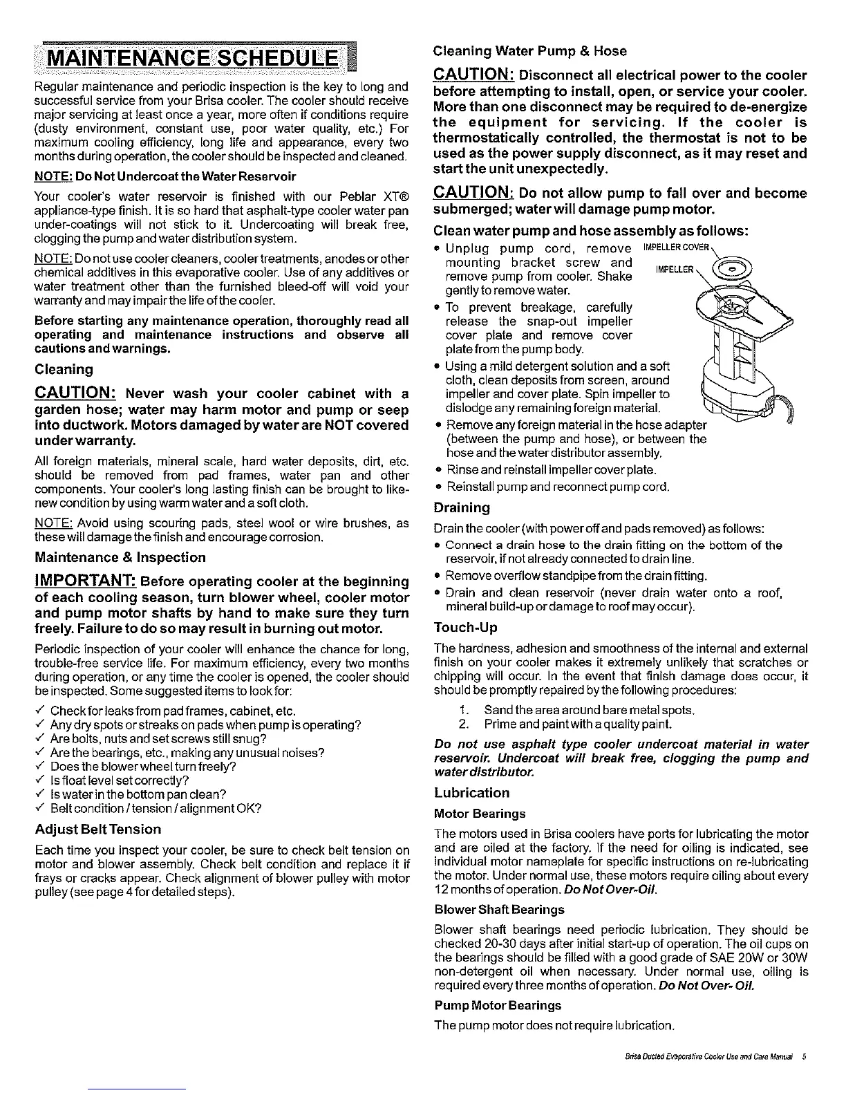 Brisa BD3000 - MAINTENANCE SCHEDULE; Maintenance & Inspection; Cleaning Water Pump & Hose